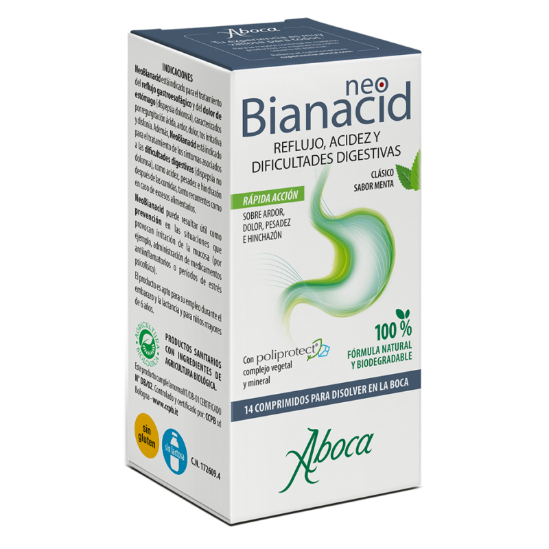 NeoBianacid protege y alivia rápidamente el reflujo, la acidez y la pesadez digestiva. Su fórmula con Poliprotect®, 100 % natural y de origen biológico, forma una barrera que protege la mucosa gástrica, neutraliza la acidez y favorece la reparación natural. Apto para embarazo, lactancia y niños mayores de 6 años, proporciona bienestar digestivo de forma segura y efectiva.