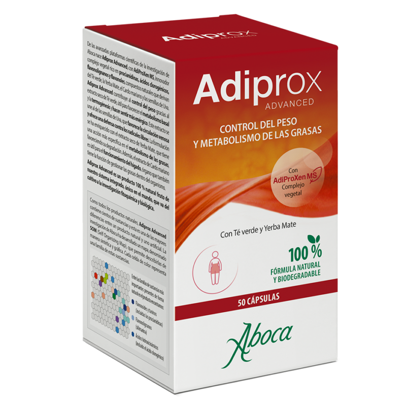 Adiprox Advanced es un complemento natural para el control del peso y el metabolismo de las grasas, formulado con Té verde, Yerba Mate, Cardo mariano y semillas de Uva. Su innovador complejo molecular AdiProXen MS combina procianidinas, ácidos clorogénicos, flavonolignanos y flavanoles para favorecer la termogénesis, el metabolismo basal y la circulación venosa, protegiendo además las células frente al estrés oxidativo.
