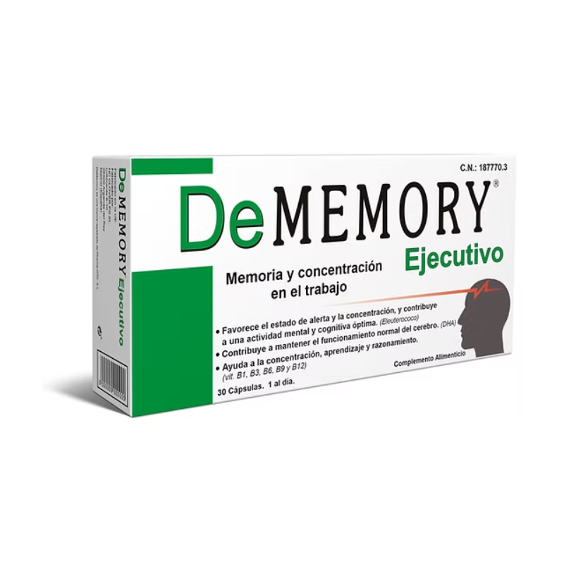 Dememory Ejecutivo es un complemento alimenticio que apoya la memoria, concentración y claridad mental gracias a su combinación de DHA, EPA, eleuterococo, vitaminas del grupo B y zinc. Favorece el funcionamiento cerebral y la función cognitiva, ayudando a mantener la mente activa. Ideal para estudiantes, profesionales o personas con alta demanda intelectual.