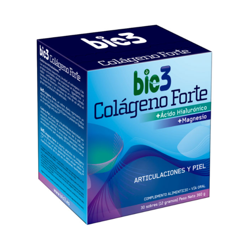 Bie3 Colágeno Forte es un suplemento en sobres solubles diseñado para complementar la dieta con nutrientes esenciales que forman parte de la estructura de los tejidos conectivos, como cartílagos, tendones, huesos y piel. Cada sobre aporta colágeno hidrolizado tipo I (Peptan®) con alta absorción, junto con ácido hialurónico, magnesio y vitaminas esenciales que potencian la elasticidad y firmeza de los tejidos y contribuyen al mantenimiento normal de las articulaciones y la piel. Es ideal para personas activas, deportistas o quienes desean cuidar tanto su movilidad como su aspecto externo.