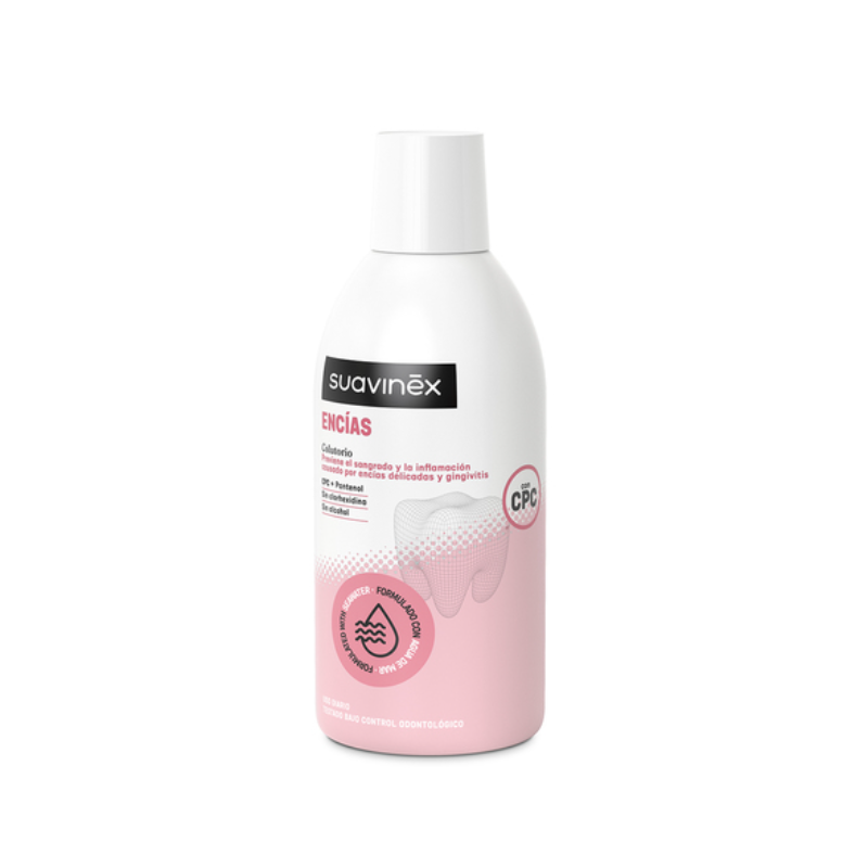Suavinex Encías Colutorio es un enjuague bucal formulado específicamente para encías sensibles o con riesgo de gingivitis, que ayuda a mantener la salud bucodental diaria. Su acción antiséptica se basa en CPC (cloruro de cetilpiridinio) y lactoferrina, ayudando a controlar la formación de biofilm (placa bacteriana) y favoreciendo unas encías sanas y menos inflamadas. Además, contiene flúor y agua de mar purificada para proteger los dientes y contribuir a la regeneración de la mucosa oral.