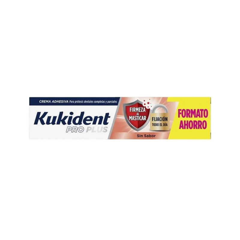 Kukident Pro Plus es un adhesivo para prótesis dentales diseñado para ofrecer una fijación extra fuerte, cómoda y duradera durante todo el día. Su fórmula sin sabor garantiza que no altere el gusto de los alimentos y proporciona un sellado efectivo frente a partículas de comida, ideal para prótesis completas o parciales.