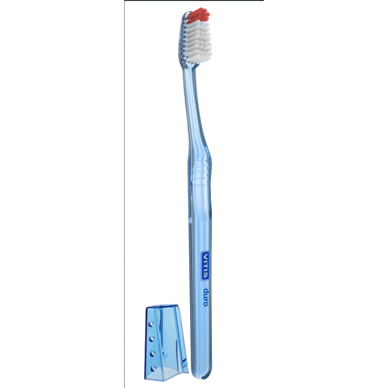 Vitis Duro Cepillo Dental es un cepillo de uso diario diseñado para la higiene bucal diaria en adultos con encías sanas y sin alteraciones dentales o gingivales importantes. Cuenta con un cabezal normal de forma diamantada que permite llegar a las zonas de difícil acceso de la boca, y filamentos duros con perfil ondulado que siguen el contorno de las encías y facilitan el acceso a los espacios interproximales para una limpieza eficaz y profunda. Su cuello maleable y su mango anatómico antideslizante proporcionan comodidad y precisión en el cepillado, favoreciendo una higiene bucal completa.
