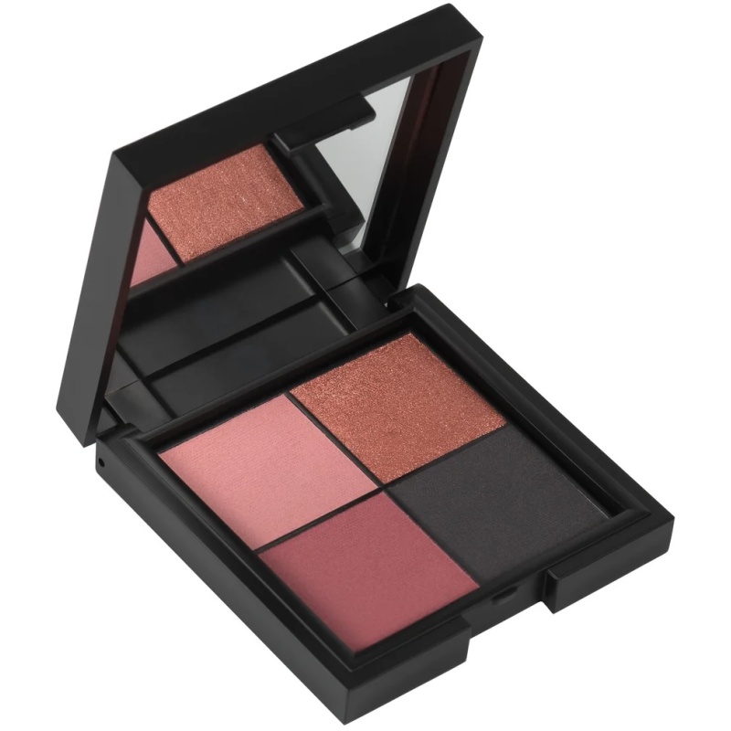 Paleta de sombras de ojos increíblemente ligera y suave que maquilla tus ojos con tonos vivos y elegantes. Con cuatro tonos de sobras: negro, rosa empolvado, rosa fuerte apagado y marrón-rosado con brillo.