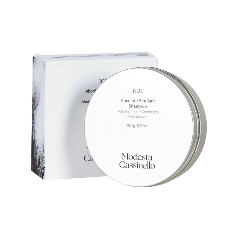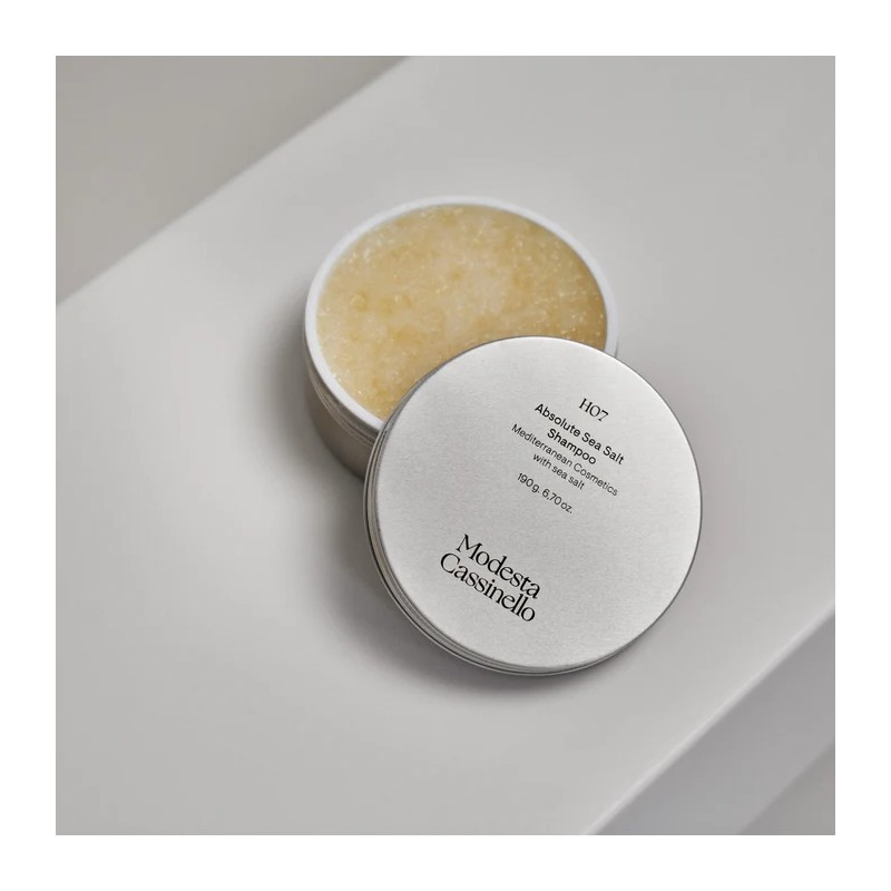 El champú H07 con Sal Marina es el best seller de la marca Modesta Cassinello. Es un champú clarificante, obtenido por evaporación del agua de mar, ideal para limpiar y equilibrar el cuero cabelludo. Con el uso de este champú, el cabello consigue quedarse suelto, con cuerpo, y limpio por más tiempo.