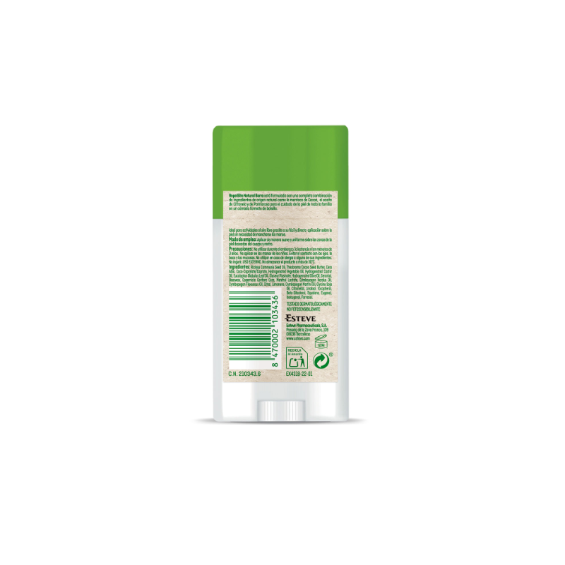 RepelBite Natural Barra está formulada con una completa combinación de ingredientes de origen natural como la manteca de Cacao, el aceite de Citronela, de Jengibre y de Palmarosa para el cuidado de la piel de toda la familia con un cómodo formato de bolsillo. Ideal para actividades al aire libre gracias a su fácil y directa aplicación sobre la piel sin necesidad de mancharse las manos.