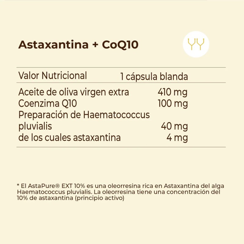 Aceite de oliva virgen extra (Olea europaea, fruto), gelatina bovina, ubiquinona (coenzima Q10), humectante (glicerina), oleeorresina rica en astaxantina extraída del alga Haematococcus pluvialis (Haematococcus pluvialis, planta entera), color (óxido de hierro negro, óxido de hierro rojo), agua.
