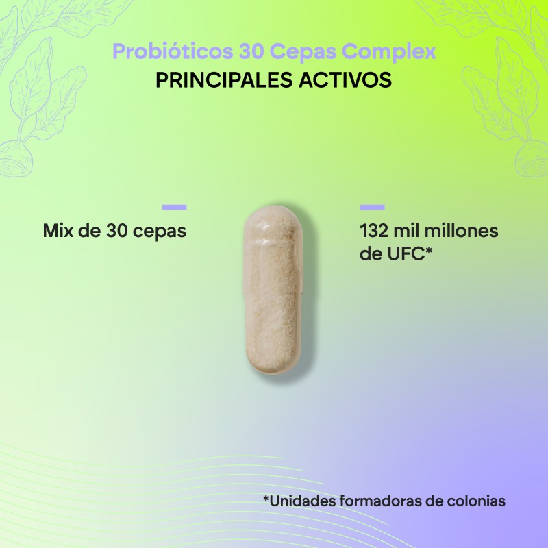 Las 30 cepas probióticas ayudan a mantener una flora intestinal equilibrada, favoreciendo la digestión, la absorción de nutrientes y el confort digestivo diario.