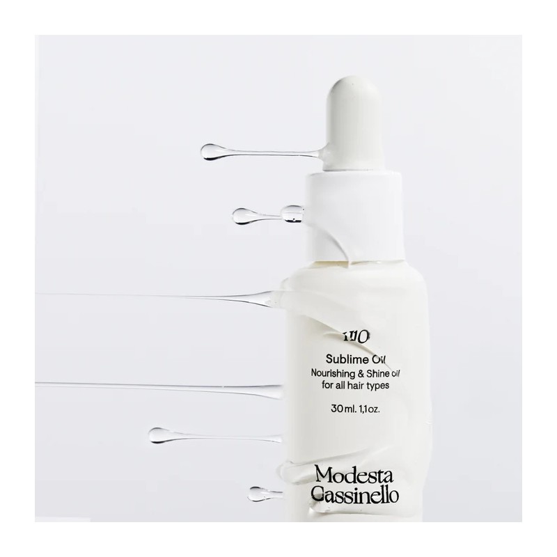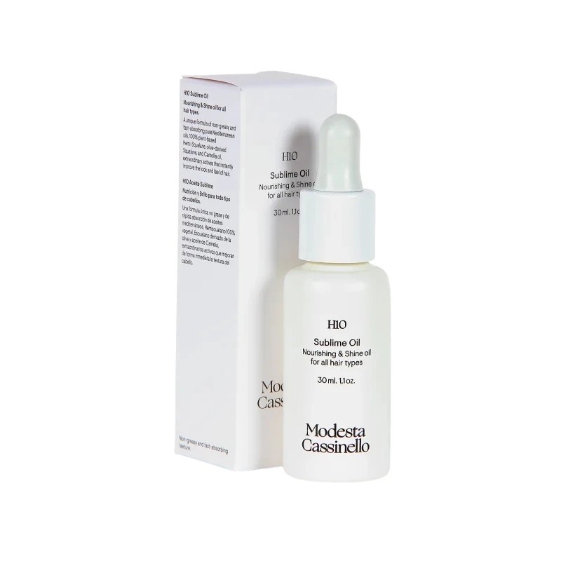 El aceite Sublime de Modesta Cassinello, es un producto para finalizar la rutina, idealmente con el cabello ya seco, que permite embellecer el cabello, aportándole brillo y suavidad. Todo ello se consigue gracias a una mezcla exclusiva de aceites del mediterráneo, teniendo como principal al Hemi-escualano, que permite ese efecto sedoso, sustituyendo a las siliconas.