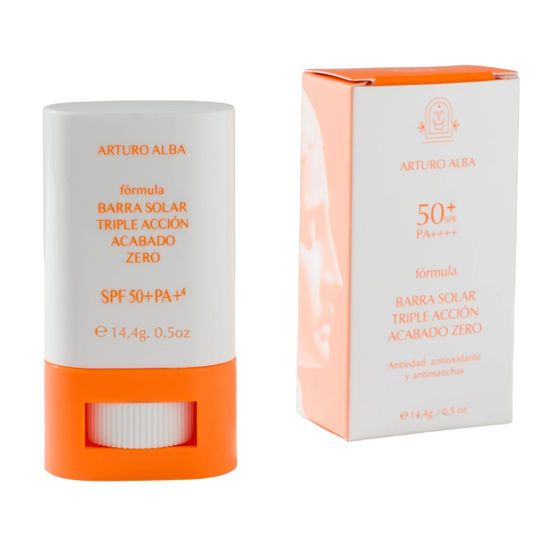 Barra Solar Triple Acción de Arturo Alba: protección solar muy alta SPF 50+ PA++++ con acabado invisible y sedoso.