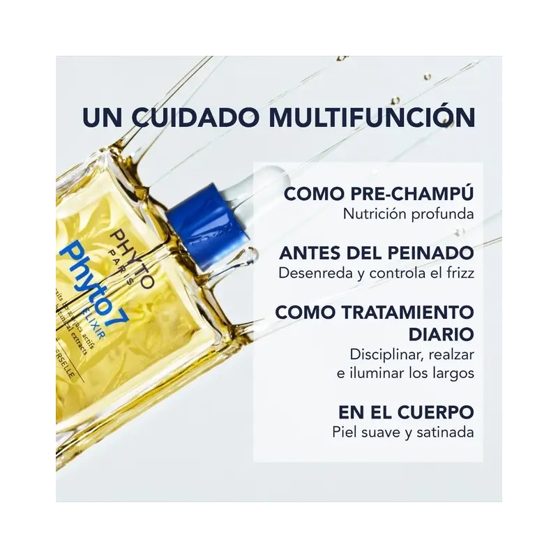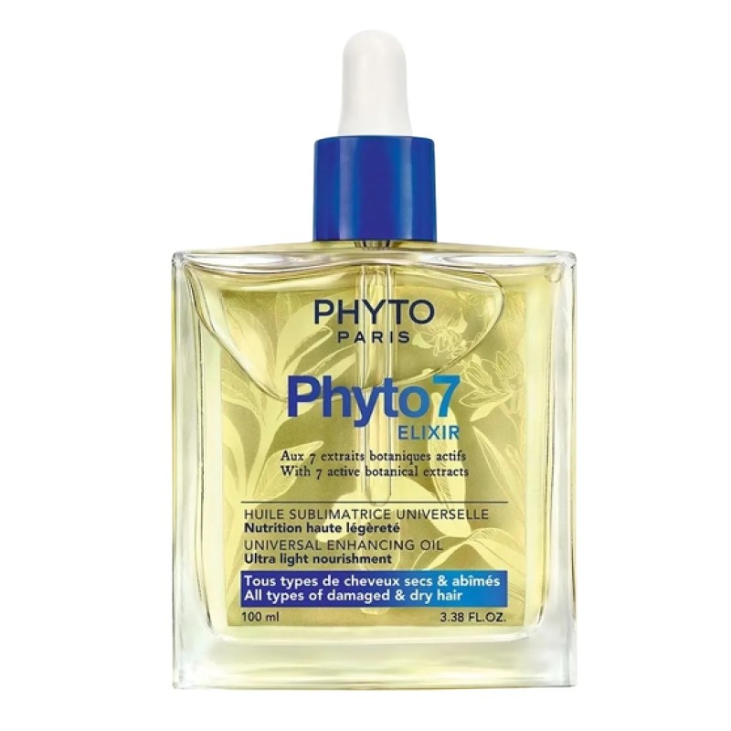 Phyto 7 Elixir es un aceite sublimador universal diseñado para nutrir y transformar el cabello seco y dañado en una melena flexible, suave y brillante. Su textura ligera no apelmaza el cabello y su fragancia chispeante convierte cada aplicación en un momento de placer sensorial. 99 % de ingredientes de origen natural y sin siliconas.