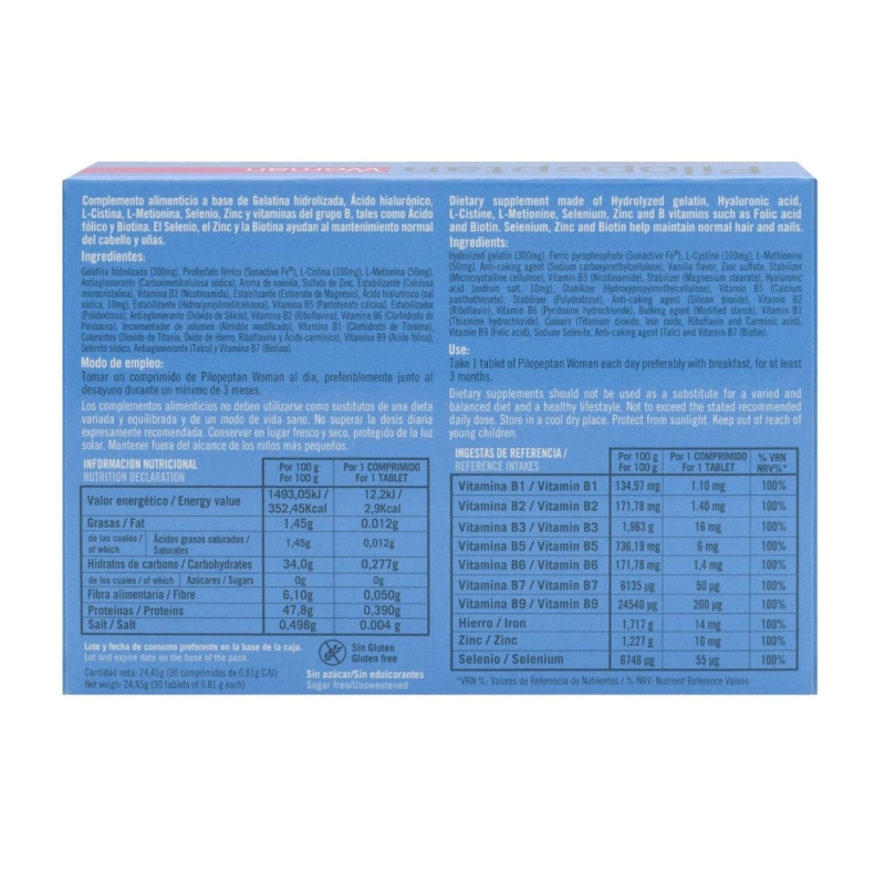Pilopeptan Woman Comprimidos estimula la fase anágena de crecimiento del cabello, induce la formación de queratina, promueve la regeneración capilar y protege y equilibra el cuero cabelludo.